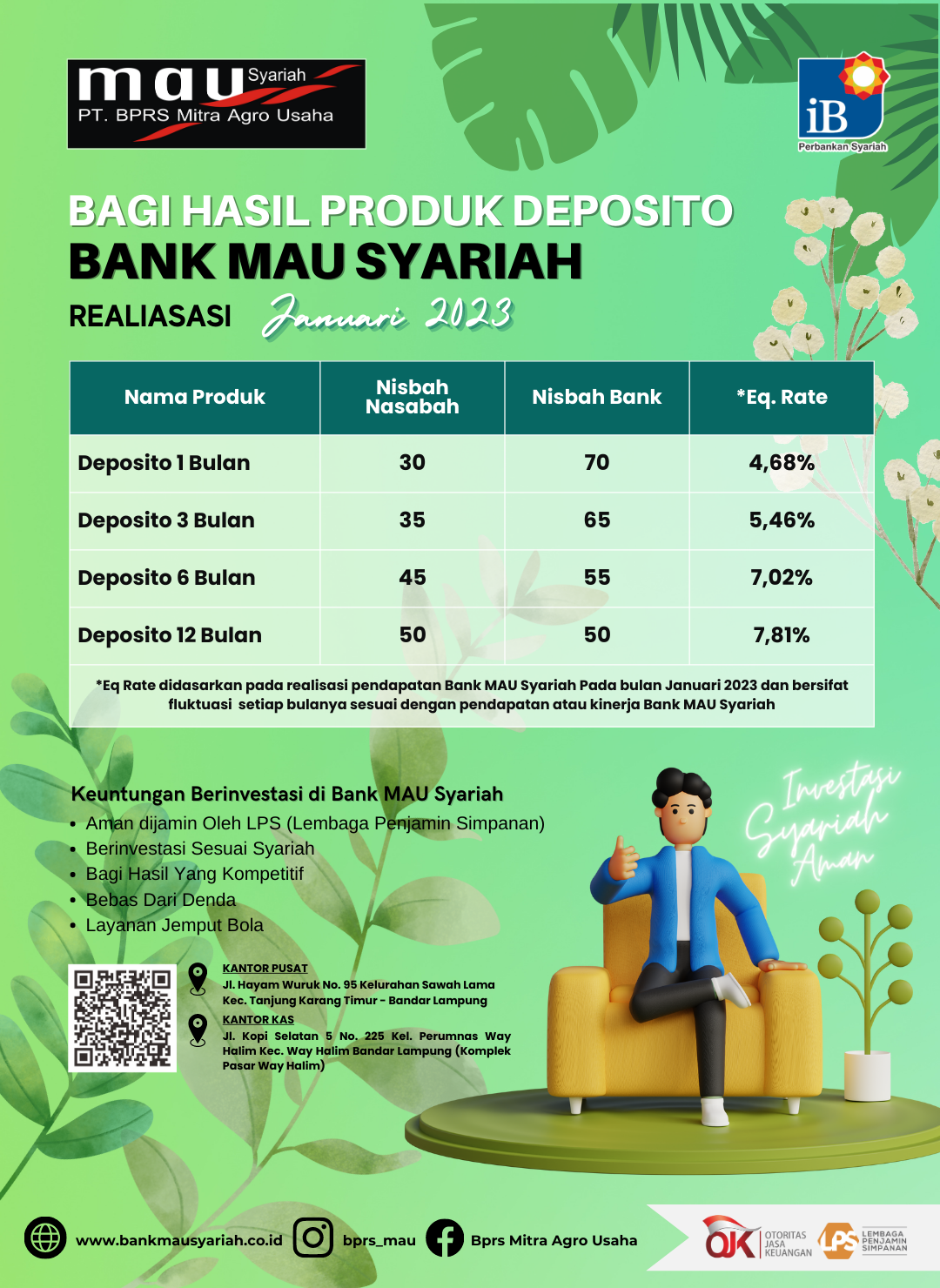 *Eq Rate didasarkan pada realisasi pendapatan Bank MAU Syariah Pada bulan Januari 2023 dan bersifat fluktuasi setiap bulanya sesuai dengan pendapatan atau kinerja Bank MAU Syariah